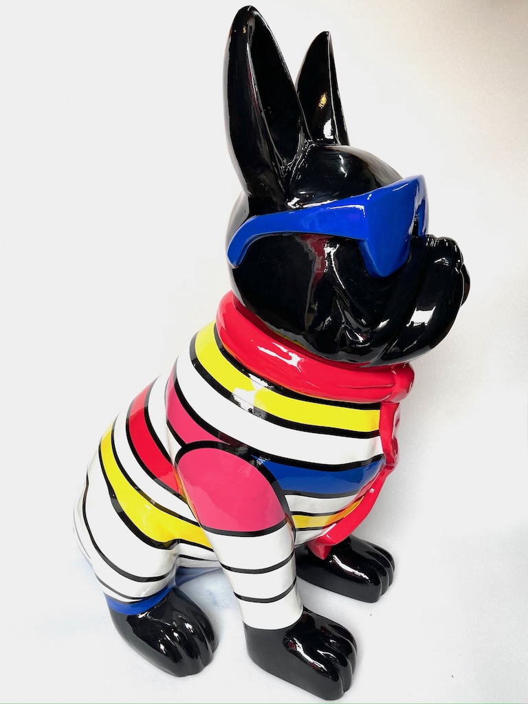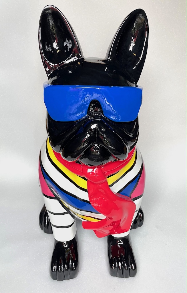 Ein handgearbeitetes Hochglanz Französische Bulldogge mit Brille für Ihre Haus und Garten oder Messen und Ausstellungen.
