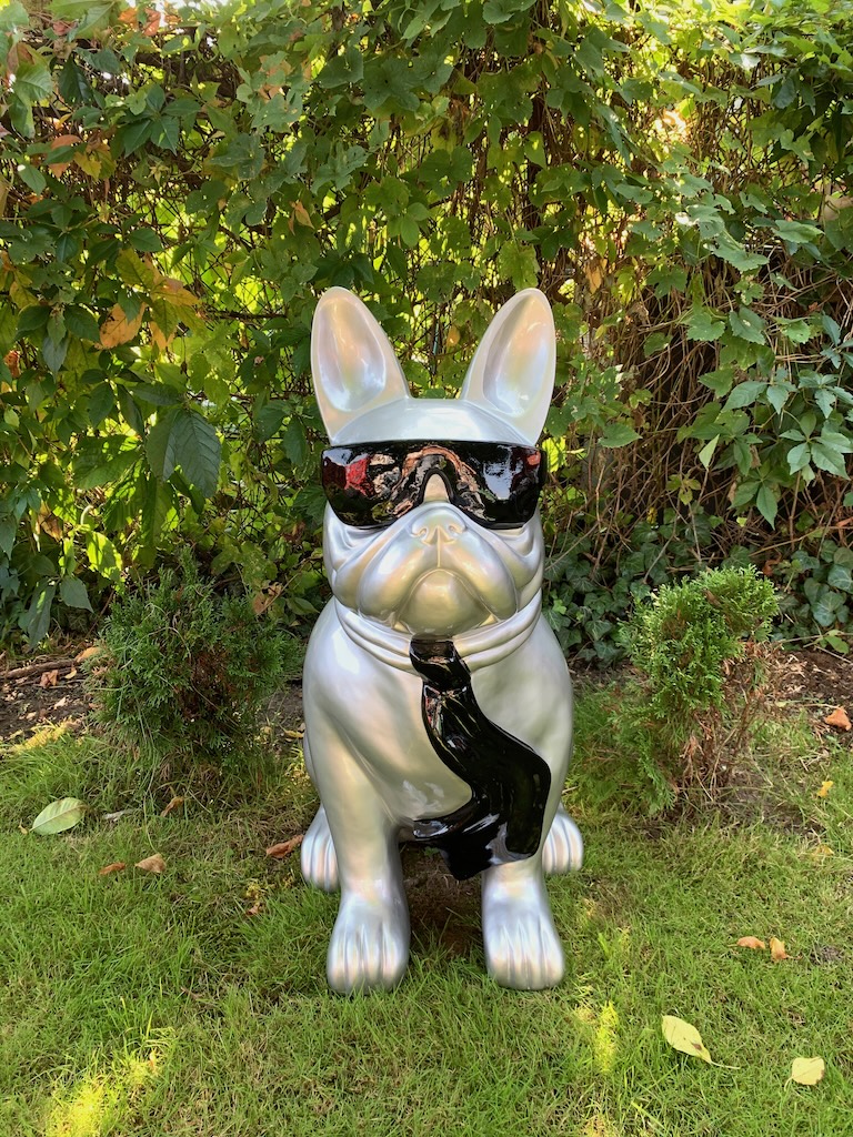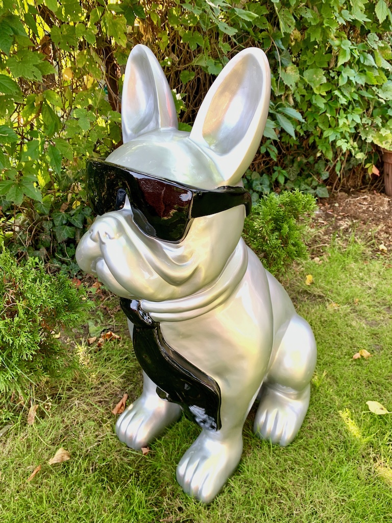 Ein handgearbeitetes Hochglanz Französische Bulldogge mit Brille für Ihre Haus und Garten oder Messen und Ausstellungen.